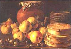Curioso género este de los bodegones, también llamados a veces "naturalezas muertas". En estos cuadros no sucede nada especial, no aparecen escenas mitológicas, religiosas, bélicas, o costumbristas, la verdad es que no hay escenas de ningún tipo. Tampoco nos es posible descubrir aquí paisajes o personajes retratados.