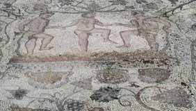 Esta bella escena procedente de la antigua Emérita Augusta (Mérida) muestra una escena que vemos en nuestras fiestas locales: el pisado de la uva, solo que estos tres caballeros lo hacían hace 2000 años. La composición de un mosaico se hacía con pequeñas piezas de mármol de colores llamadas teselas. Su pequeño tamaño y el cuidado detallismo producen composiciones maravillosas que, además, son inalterables.