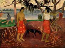 Gauguin utiliza una gran simplificación en los detalles (por ejemplo el perro, el prado o el campesino) pero se entrega a una verdadera orgía de color, rojos, verdes, rosas, azules, ocres, naranjas, todos ellos intensos y sugerentes. Tienes que tener en cuenta que en Tahití (clima tropical en el Pacífico sur), la realidad es muy variada cromáticamente, las tierras, las plantas y las frutas parecen un muestrario de pinturas. Lo único que hace Gauguin es subrayar este aspecto. La contemplación de este lienzo nos produce tranquilidad y sosiego, ¿no te gustaría perderte unos días en estas paradisíacas islas de Polinesia?.